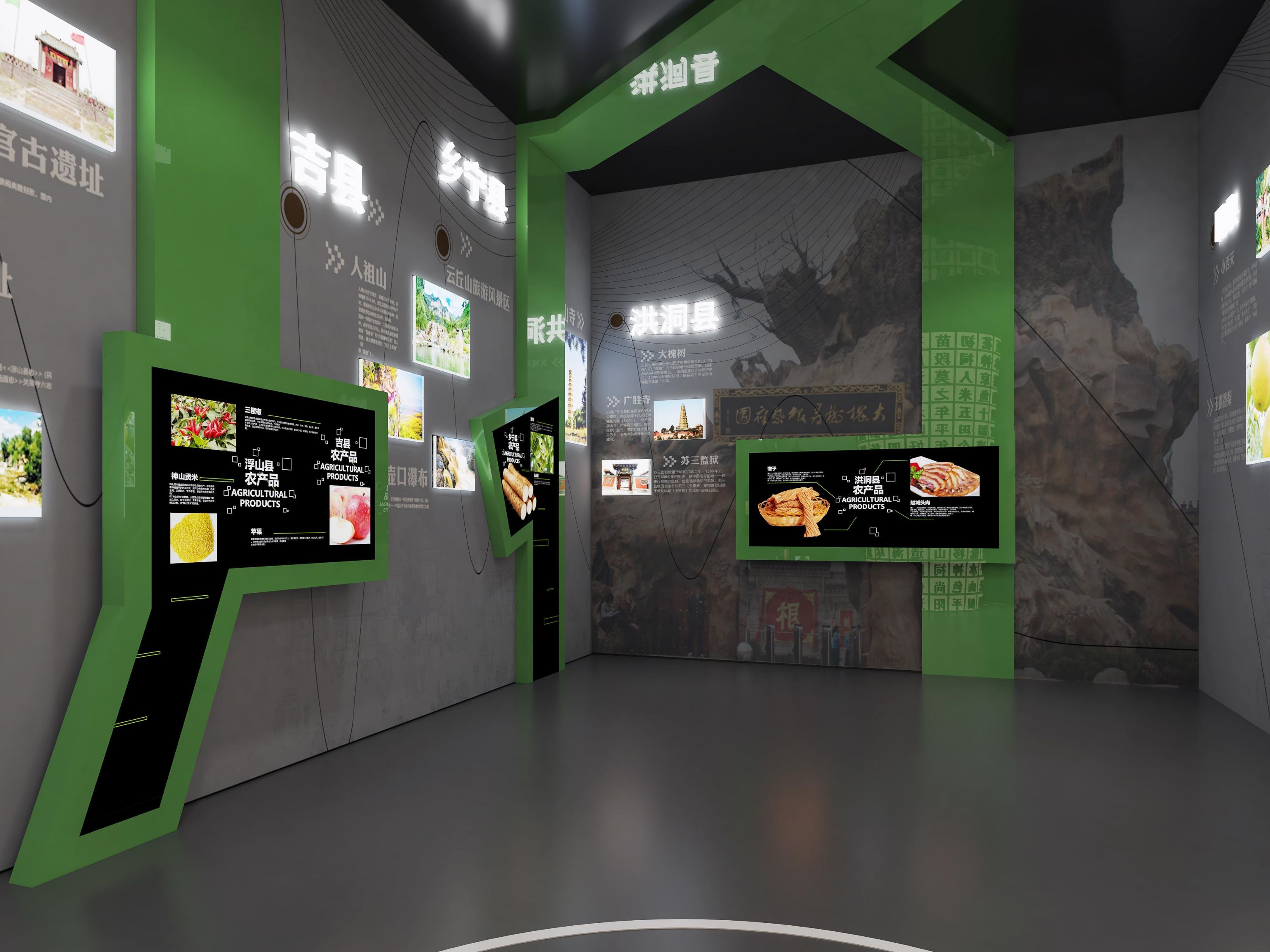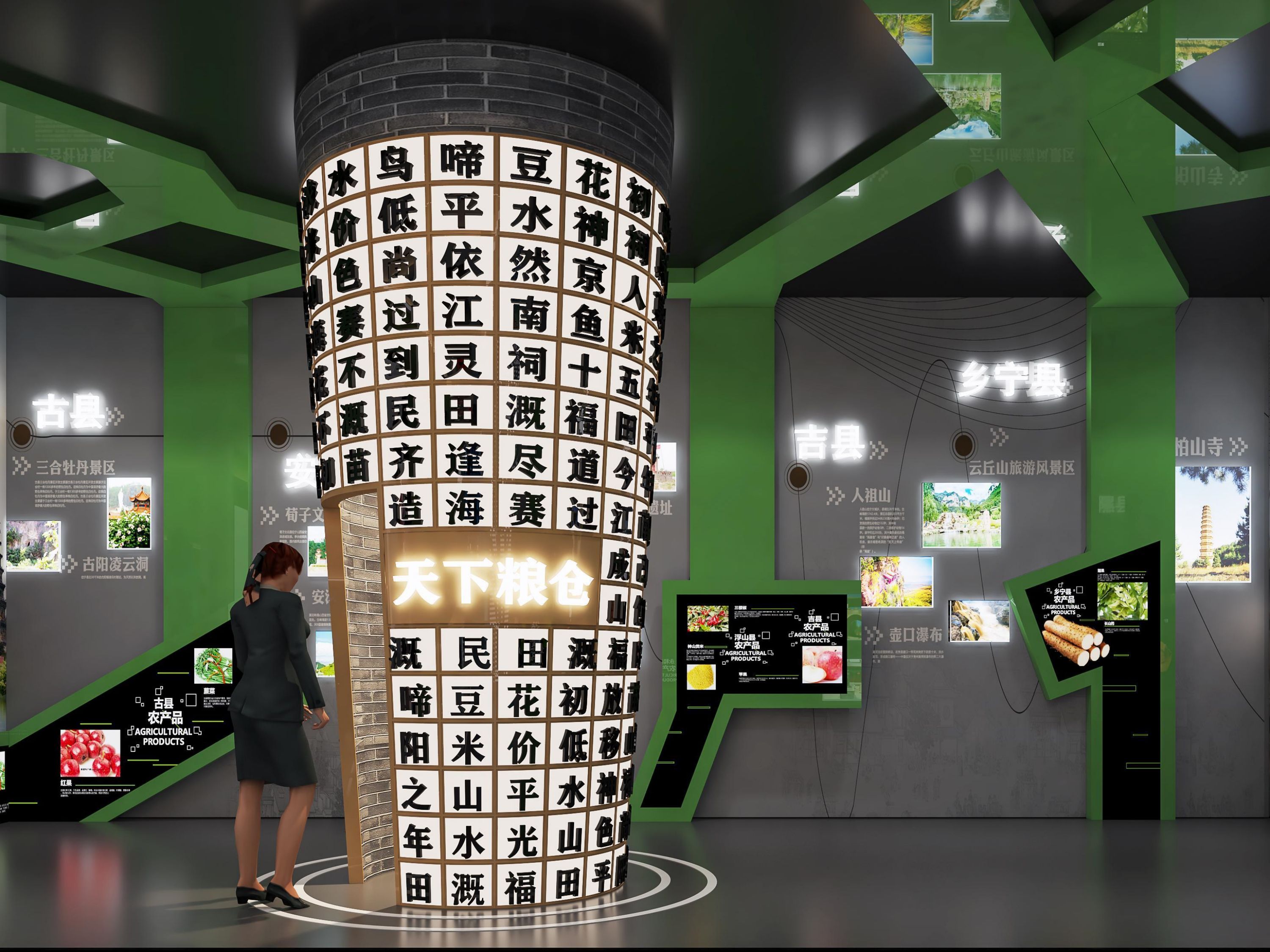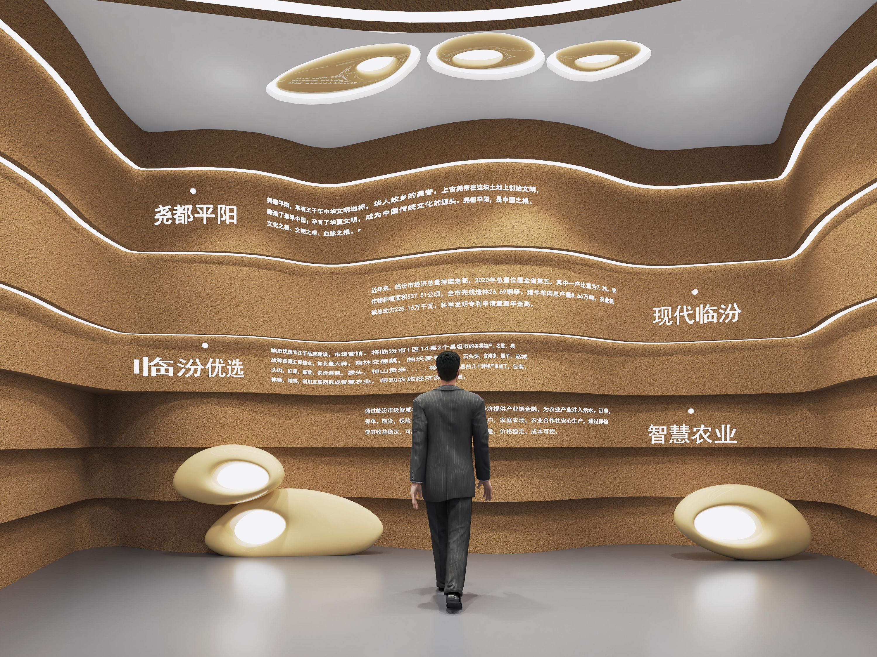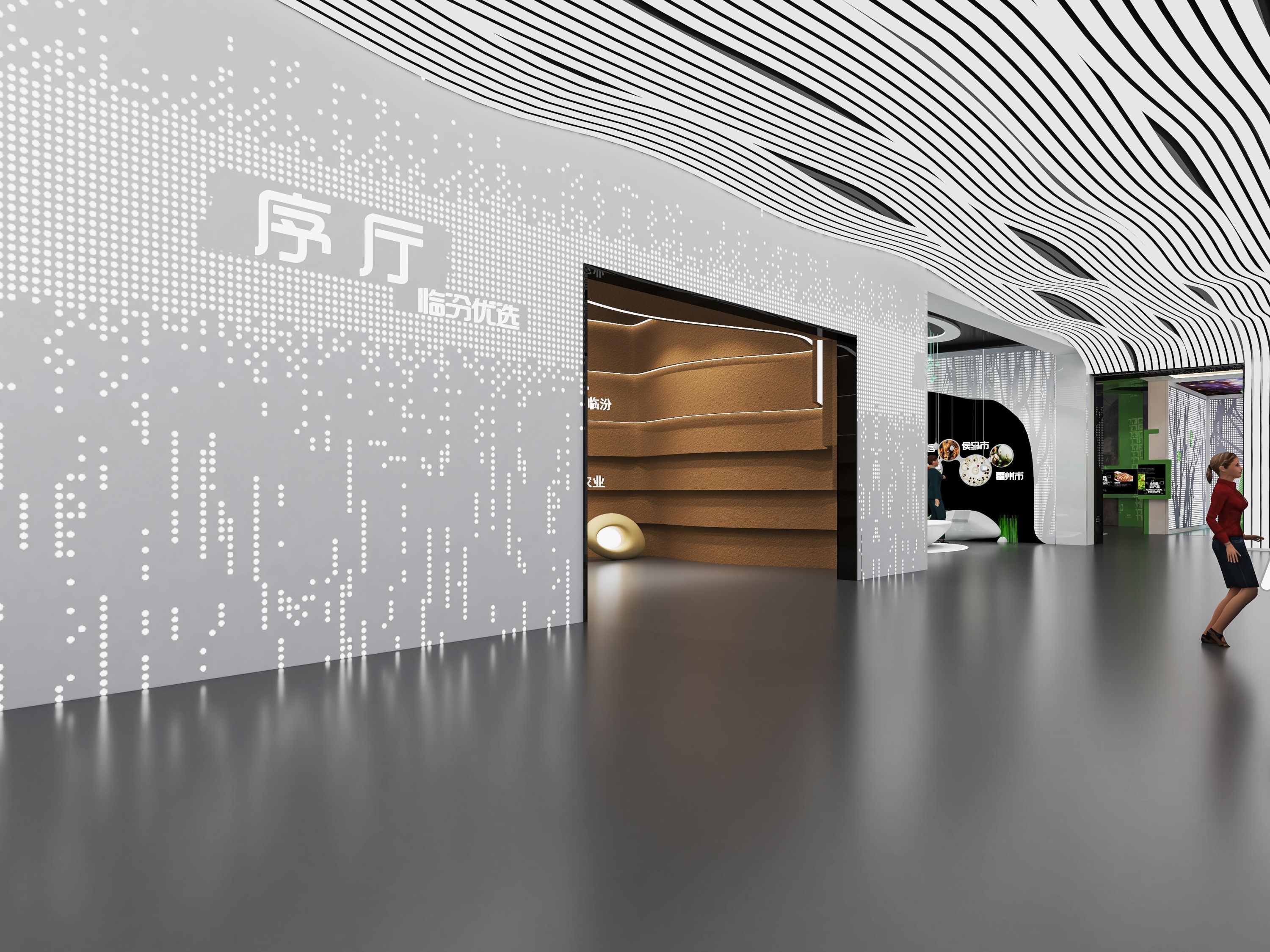 设计出发点:关于临汾优选的序厅,我们采用风吹麦浪和谷堆的设计理念,通过层层跌落的水平向挑板,隐喻麦田里的自然和活泼。室内展陈区,我们在核心区位设置了天下粮仓的设计理念,通过数字表皮和圆柱形的筒体结合,形成展览展示空间与表皮化肌理的统一。采用临汾特产地图的立体墙设计理念,将10多个县区的特产做区位分布,与竖向分布整体结合,并在主展区通过传统展板和LED触摸互动展览导视等两种模式形成视觉输出,并形成观展主要路径。中部自由区通过设置深度挖掘的主题做文创和输出,采用VR,MR等互动融合的科技手段形成观展多元化。