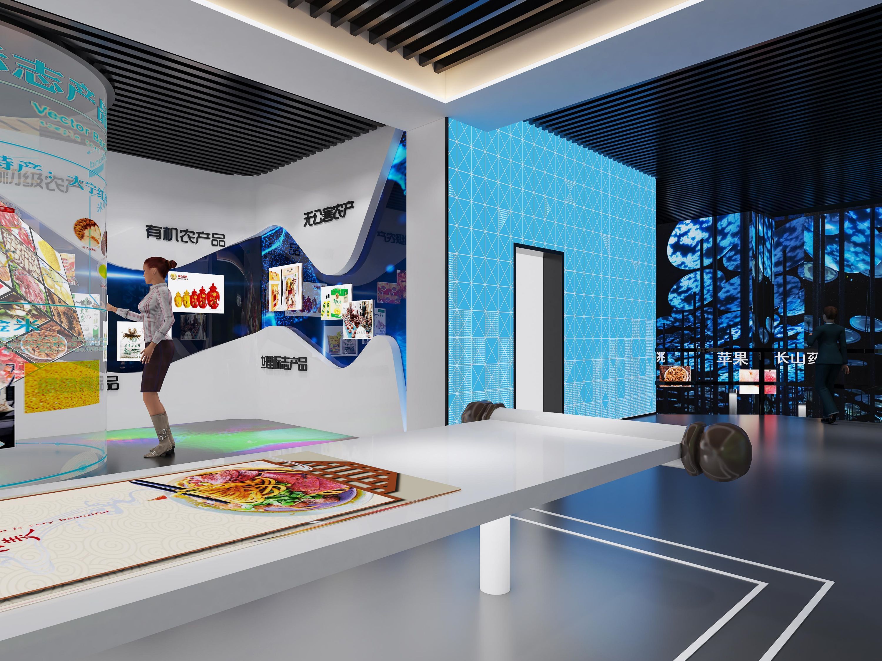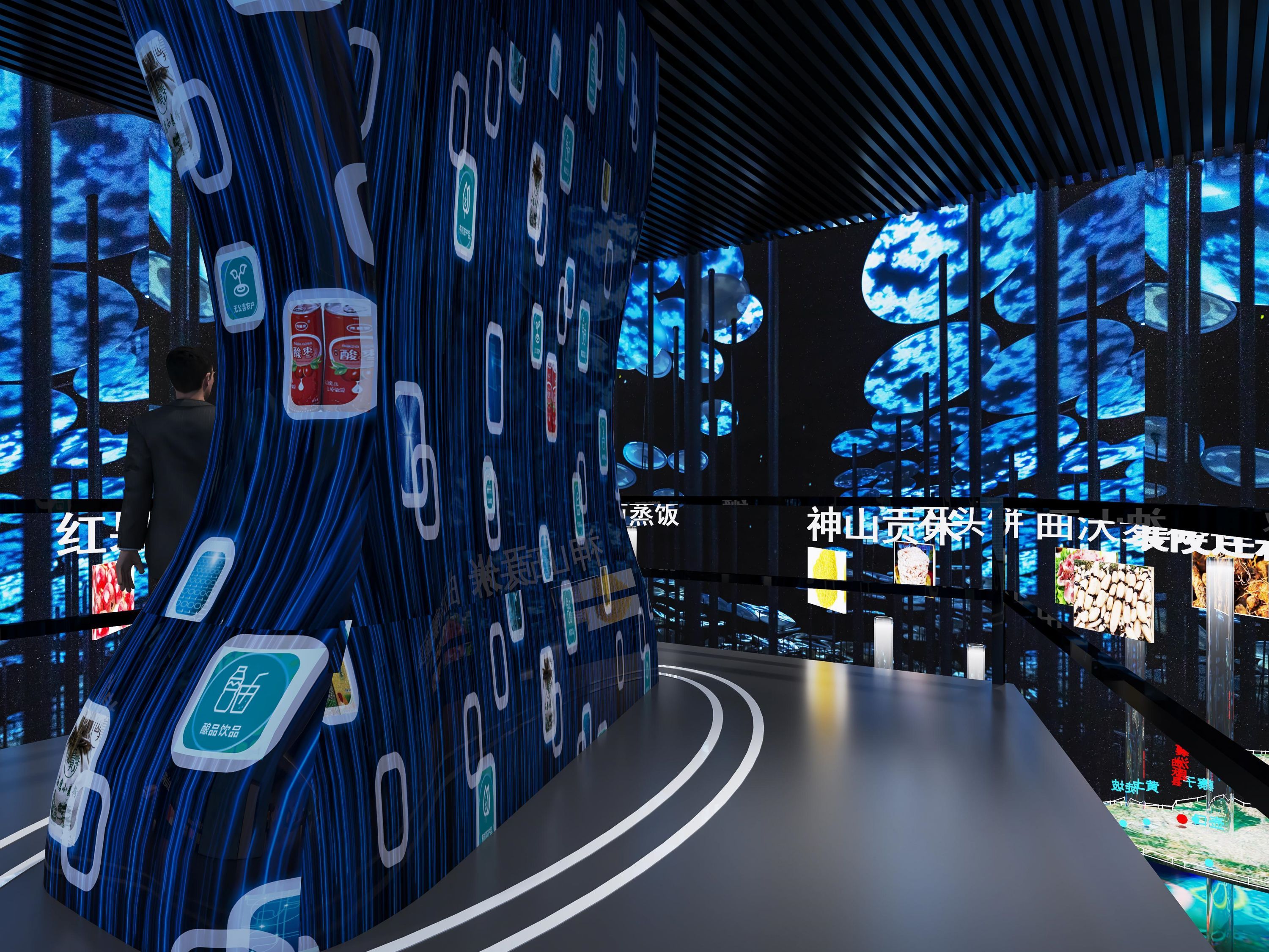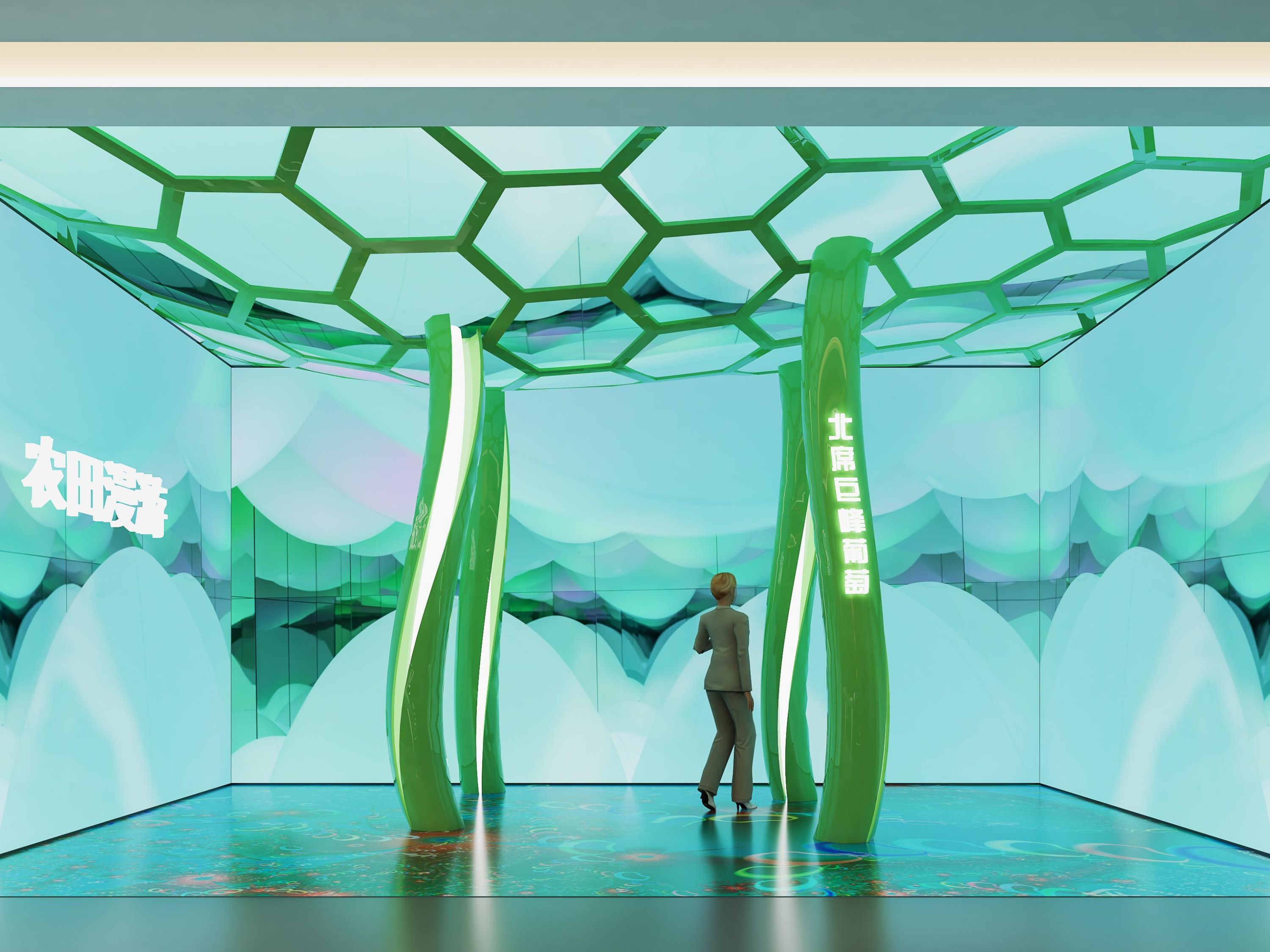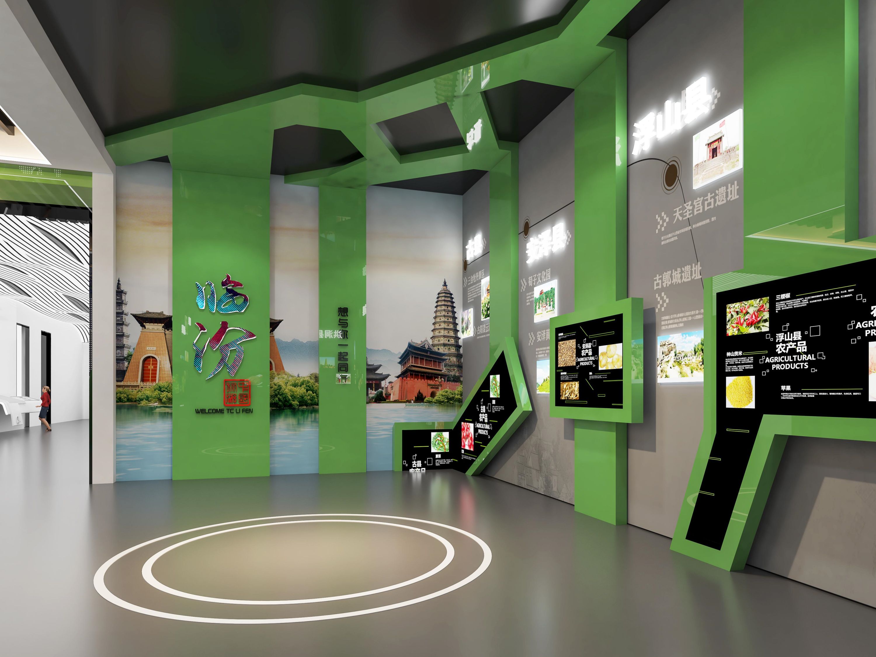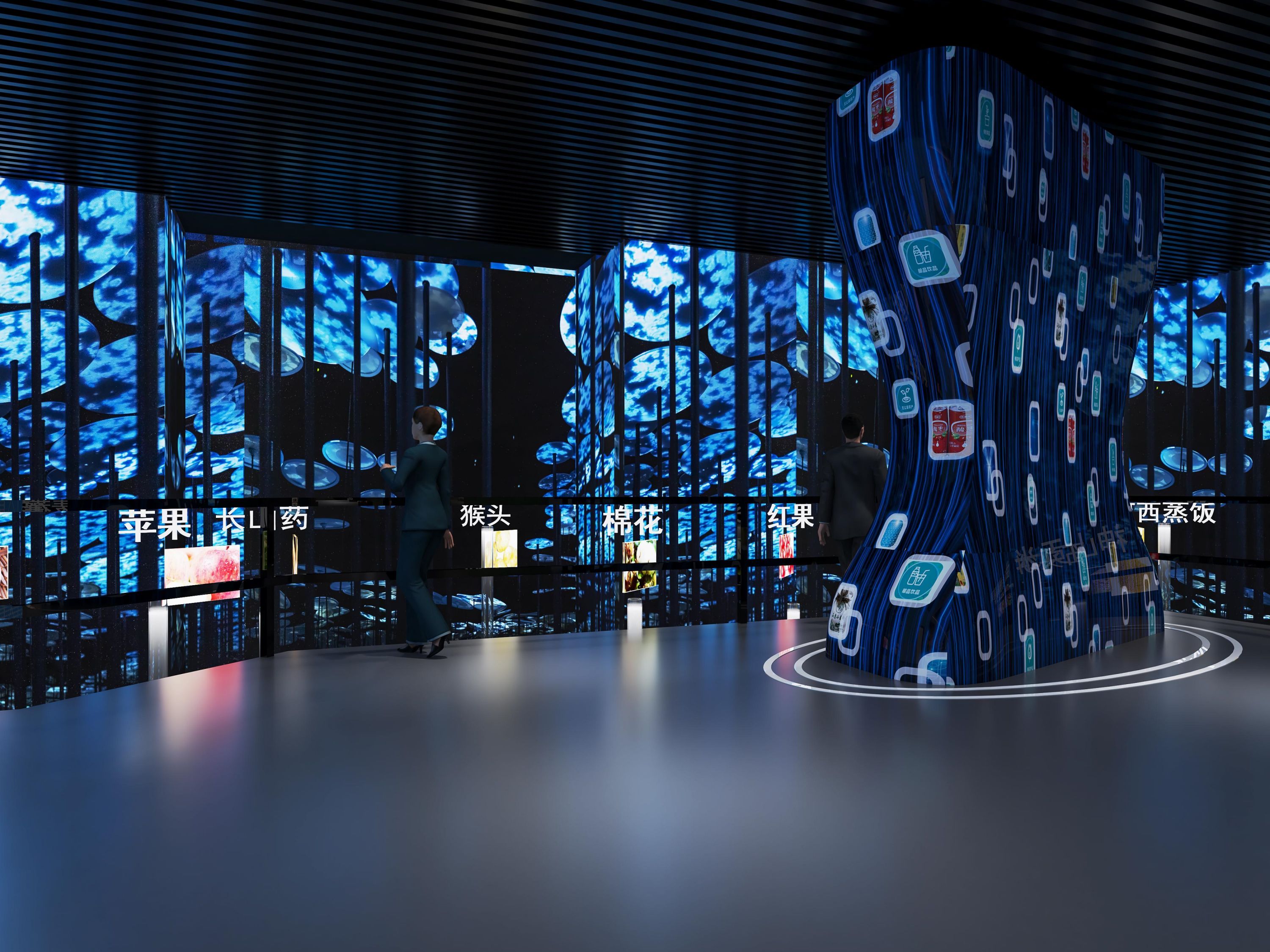 设计出发点:关于临汾优选的序厅,我们采用风吹麦浪和谷堆的设计理念,通过层层跌落的水平向挑板,隐喻麦田里的自然和活泼。室内展陈区,我们在核心区位设置了天下粮仓的设计理念,通过数字表皮和圆柱形的筒体结合,形成展览展示空间与表皮化肌理的统一。采用临汾特产地图的立体墙设计理念,将10多个县区的特产做区位分布,与竖向分布整体结合,并在主展区通过传统展板和LED触摸互动展览导视等两种模式形成视觉输出,并形成观展主要路径。中部自由区通过设置深度挖掘的主题做文创和输出,采用VR,MR等互动融合的科技手段形成观展多元化。
