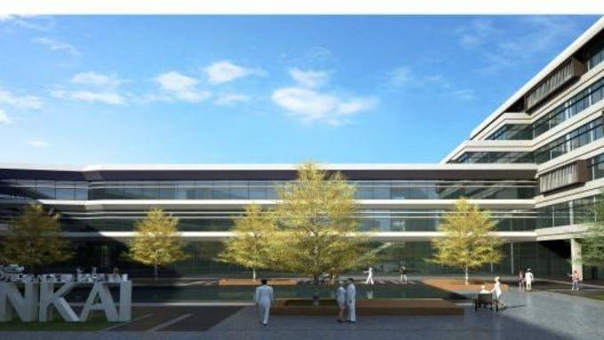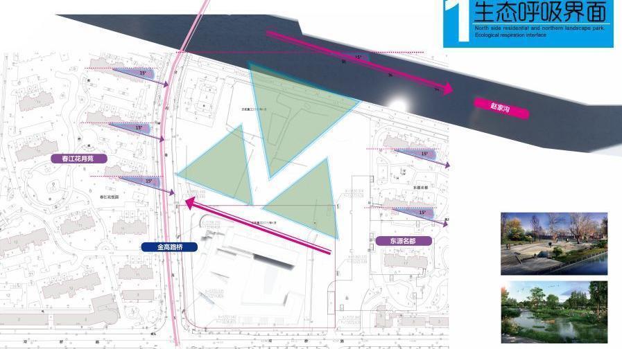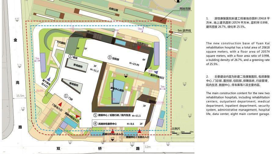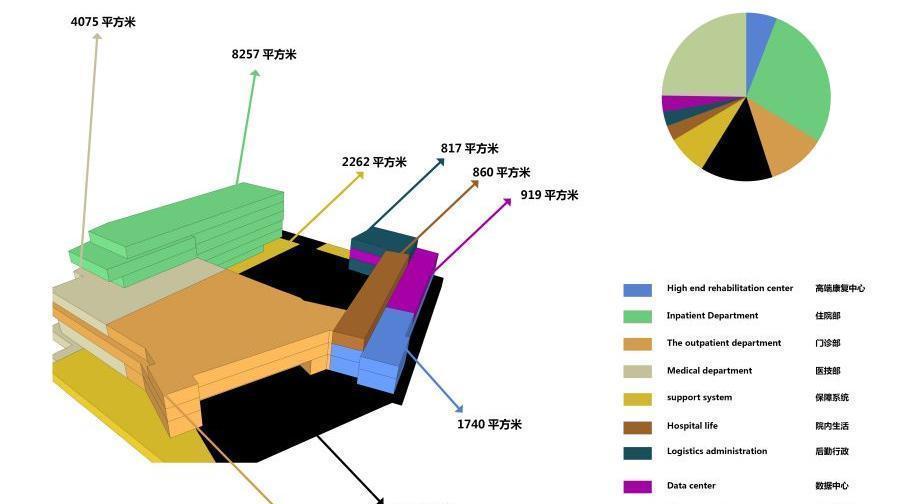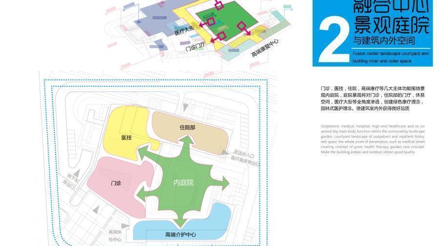 设计出发点1:北侧景观公园和河流的流向略倾东南,2.周边住宅建筑的朝向和肌理,3.回避高架道路的朝向干扰。将建筑的北界面向东轻转15度。使得北侧景观公园和北侧建筑界面自然融合,形成良好朝向及景观关系,从形成生态呼吸效应。融合中心景观庭院与建筑内外空间门诊,医技,住院,高端康疗等几大主体功能围的景观内庭院,将门诊,住院部的门厅,休息空间,医疗大街等全角度渗透,创建绿色康疗理念,园林式医护理念。使建筑室内外获得良好品质。设计出发点2:形成南侧高端康疗医养商务街区,通过打造南侧的高端康复中心,使双桥路形成整体的街道氛围。高端介护中心,高端体检中心,医疗康复数据处理中心等于南侧分别设置三个出入口,自成体系又资源共享。其立面风格与街区建筑整体风格协调。