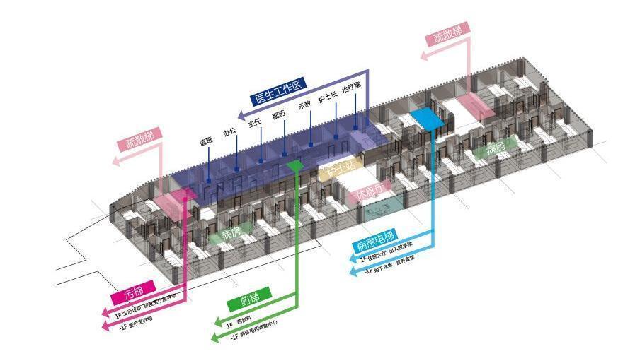 设计出发点4:独立的医生休息露台,医生区位于用地西侧,在三层设计医生休息露台,与医生的各个工作科室结合,是医生休息放松的地方。